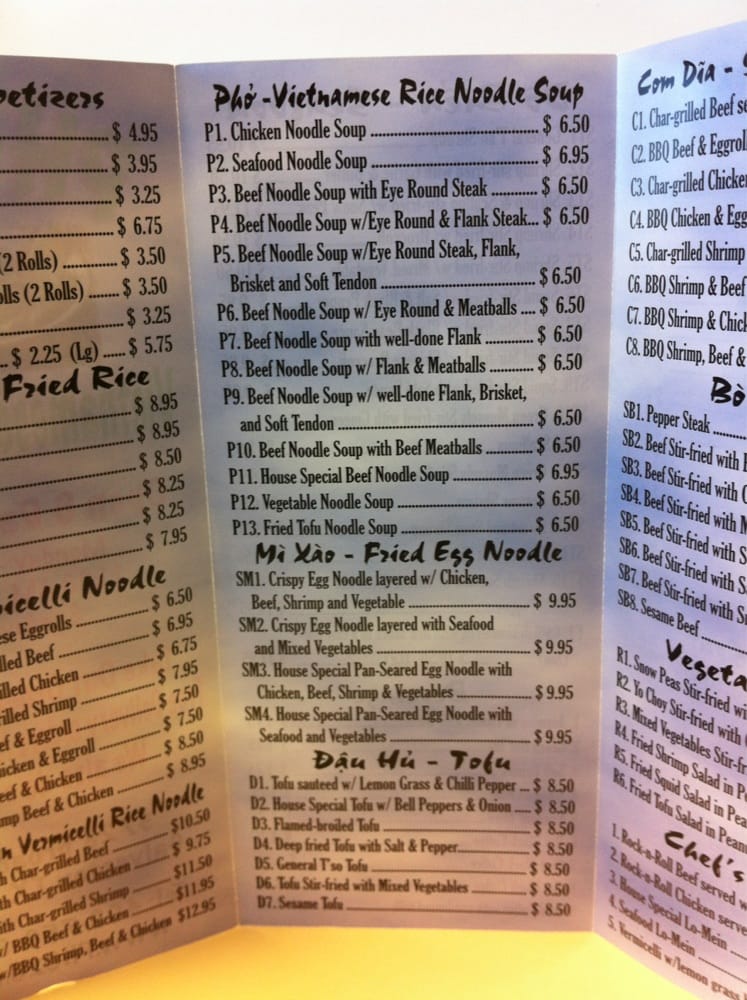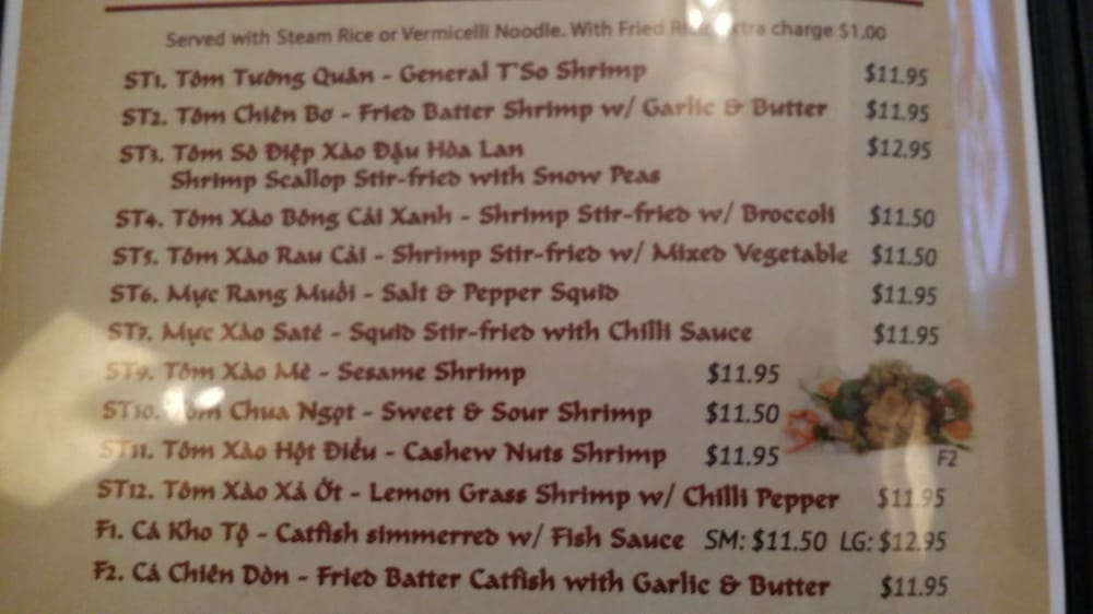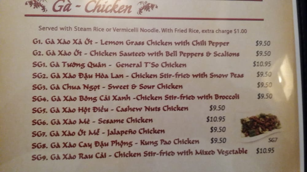 The menu is a treasure trove of options crafted with care. For chicken lovers, try the Ga Xao Xa Ot—tender lemongrass chicken bursting with zest. Vegetarians can indulge in the Xao Ot, a spicy lemongrass tofu dish paired with fresh vegetables. Don't miss the crispy egg noodles like the Mi Xao Don Thap Cam, featuring a savory medley of proteins and veggies. Customers rave about the mixed veggie pho and its aromatic broth, making it a must-try!